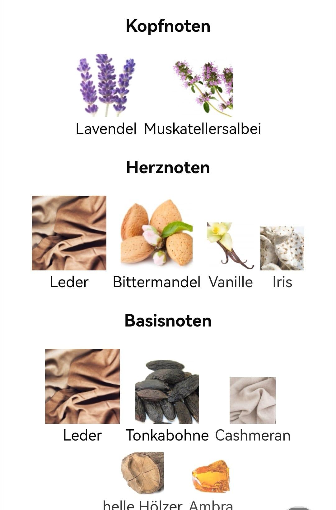 Leder, Tonkabohne, Cashmeran, helle Hölzer, Ambra